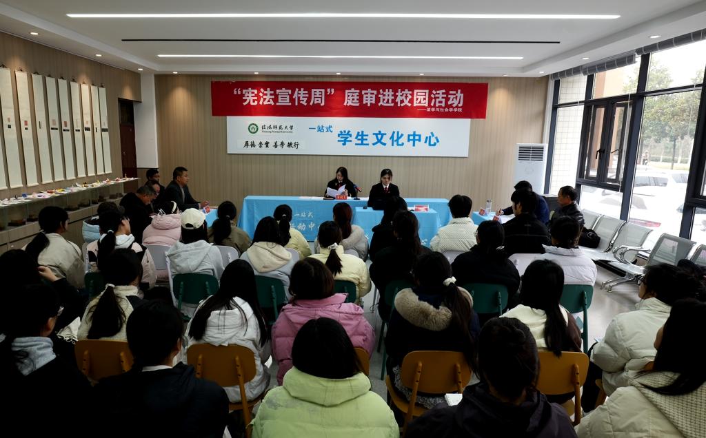 时间:2025-12-03 15:07 来源: 作者: 阅读: 次为扎实推进“宪法宣传周”活动,2025年12月2日下午,受十大合法博彩网站大全 邀请,“全国首批枫桥式人民法庭”——信阳市浉河区人民法院董家河法庭在我校一站式学生文化中心开展“庭审进校园”活动,活动吸引了100余名师生参加旁听。