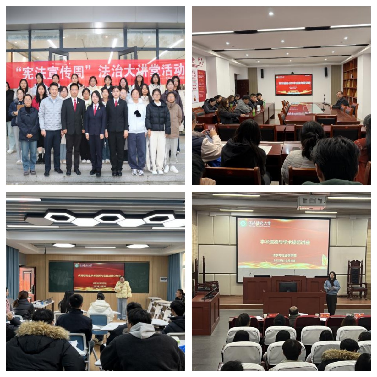 11月25日,十大合法博彩网站大全 在社科楼412举办2026年研究生“学术文化节”“学术明星”评选会。副院长张玉鹏,教师杨柳、刘文君、孔令媛出席活动并担任评委。2025年12月2日,十大合法博彩网站大全 邀请信阳市浉河区人民法院董家河法庭于学生文化中心作“新时代‘枫桥经验’的法庭实践”专题报告。12月9日在社科楼413报告厅举办科学道德与学术诚信报告,本次邀请张玉鹏、刘文君老师担任主讲嘉宾。12月10日在教八楼205教室举办了研究生“榜样示范报告”。本次活动邀请了研究生国家奖学金获得者胡诗雨、谢博文同学,以及河南省“挑战杯”大学生课外学术科技作品竞赛一等奖获得者井泽源同学。