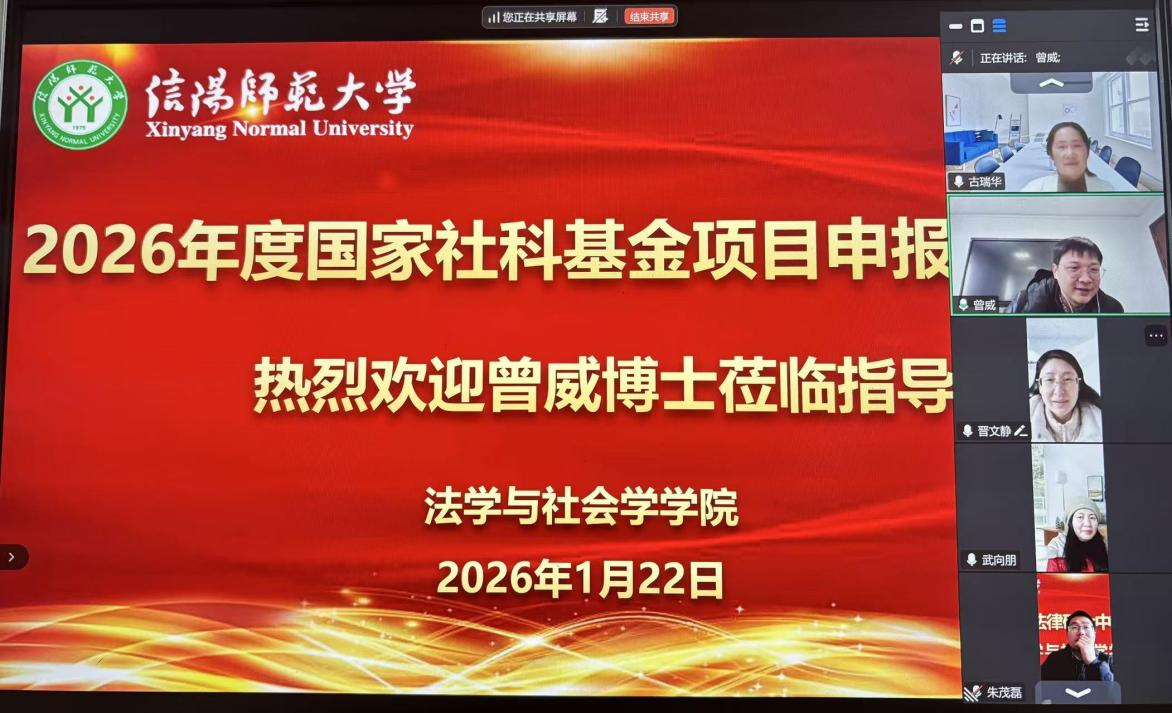 时间:2026-01-24 14:17 来源: 作者: 阅读: 次1月22日下午,十大合法博彩网站大全 于线上腾讯会议举办国家社科基金项目申报一对一指导会。特邀杭州师范大学沈钧儒法合法博彩 曾威博士主讲,合法博彩 院长古瑞华、副院长武向朋、张宇及全体拟申报教师参会,会议由武向朋主持。