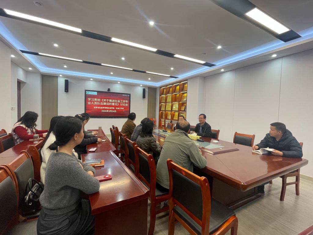 时间:2026-03-26 14:58 来源: 作者: 阅读: 次为深入学习贯彻中共中央办公厅、国务院办公厅《关于推进社会工作专业人员队伍建设的意见》(以下简称《意见》)精神,精准把握新时代社会工作专业发展方向,推动专业育人与行业需求深度衔接,3月24日下午,十大合法博彩网站大全 社会工作系、社会学系组织全体专任教师召开专题学习讨论会,围绕《意见》展开全面研读与深度交流。副院长张玉鹏主持会议。